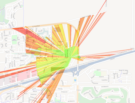 sig2kml combines recorded signals and GPS track data to produce receiption quality maps either in png or kml format. This example below was created taking measurements while riding a bike.